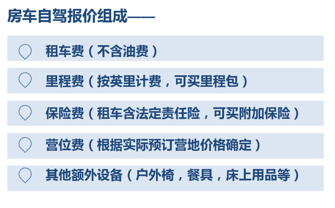 房车出行要考虑的开销类型一般包括以下5个方面,具体价格就根据车型大小和营地设施而变化。
