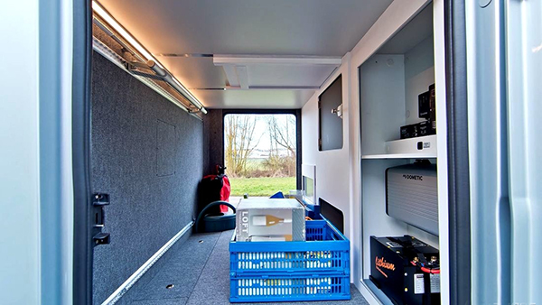 NOVA EB 车身后方的贯通式储物舱,内部配备有照明灯,内侧人性化的设计较多,靠近室内的一侧分格明确,储存物资也较为方便。我们可以看到储物舱地板非常平整,在我们拿取大件物品时,不至于受阻太大。