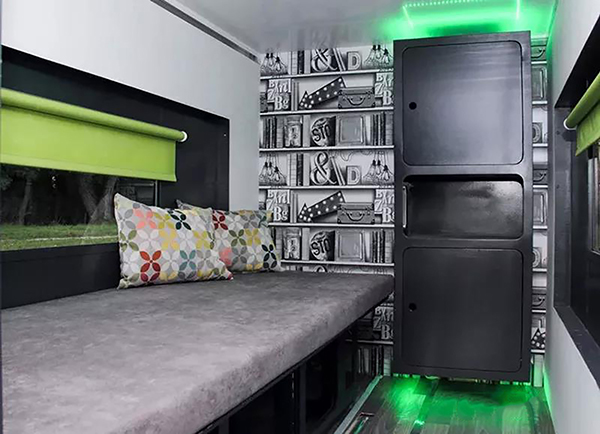 内部主卧拥有一个190 x 144cm的双人床,次卧的床尺寸为190 x 80cm。配置的冷暖空调、23英寸可触屏控制中心,提供照明、冰箱、空调的控制调整和电池及水位的容量显示,也可以用作播放视频。
