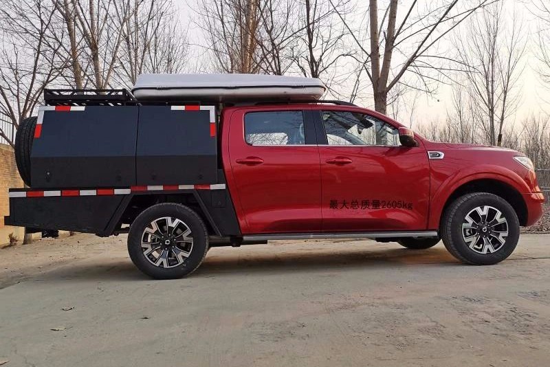 长城炮露营车采用长城汽车最新推出的长城炮乘用版本为基础,搭载一款2.0T GW4C20B汽油发动机,匹配8AT变速箱,最大功率145Kw,达到了国六的排放标准,并配备了分时四驱系统。整车尺寸5568×1936×2180/2010/1886(mm),荷载人数5人。