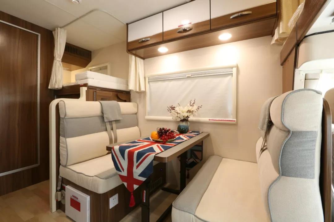 上下铺布局中部设置对开卡座,餐桌降下后可以与沙发拼接成床,车辆后部设置有右侧上下铺单人床,左侧上铺单人床,驾驶区上部双人床(带爬梯),床位独立性强,多人出行休息相互不干扰,满足对空间私密性的要求。