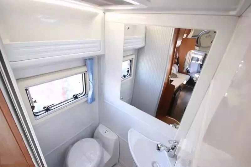 厨房区配有洗菜盆、电磁炉、置物架、储物柜、微波炉、抽油烟机、外推窗、多功能插座等设施,可与外置厨房一起配合使用,厨房旁的房车专用车载冰箱容积为148L;卫生间配备塞特福德房车专用座便器、洗手盆、卫浴镜、外推窗、抽拉式淋浴器、毛巾架、置物层和换气扇等设施,可满足日常洗漱需求。