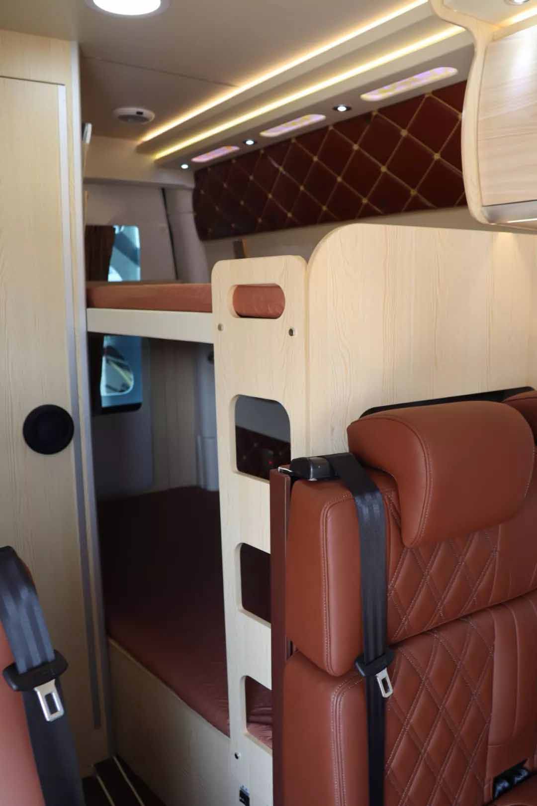 车内的感觉与车的外观完全不同,驾驶室内座椅采用真皮包覆,舒适感极佳,车座的菱形格纹设计更是增添了整车的时尚感!车厢中部会客区把液晶电视也安装在车门的上方,无论是坐在四人对坐的真皮沙发上,还是躺在车顶的额头床上,都可以观看自己喜爱的电视节目。