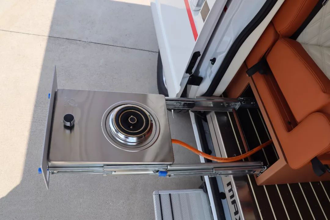在双人沙发下方可是暗藏机关的——抽拉式煤气灶。在车外做饭既不受空间的限制,又可以避免油烟在车内散不去的问题,是不是十分优秀?