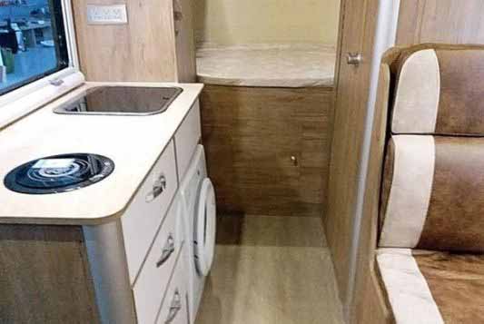 车厢中部是厨房和卫生间,在厨房储物柜下方还配备了一台小型滚筒式洗衣机。