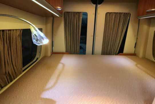 车内驾驶室上方的床位两用功能,翻转上去即有一个32寸海信网络电视,翻下则为双人大床,可通过配备的爬梯上下;超大顶置双人床1.5m*2.1m,内空间优于同类车型,无压抑局促感。