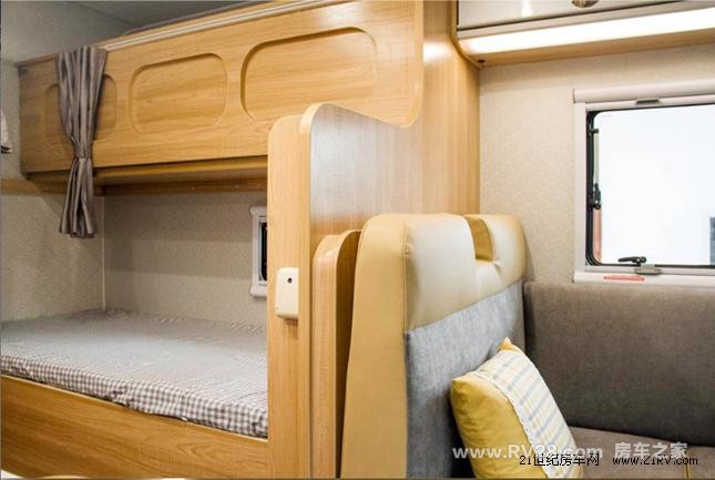 内饰布局: 该车采用了浅色系为车厢装饰的主色系,风格小清新。驾驶舱和车厢之间使用拉帘做软隔断处理,平时保证通风采光,必要时增加隐私保护,一举两得。额头双人床(长2130毫米、宽1400毫米)两侧设计有外推窗,在一定程度上降低天花板产生的压迫感。会客区的卡座沙发在座位和靠背上进行了软包裹,增加舒适度。多功能餐桌可以通过调节高度与卡座沙发组成床。