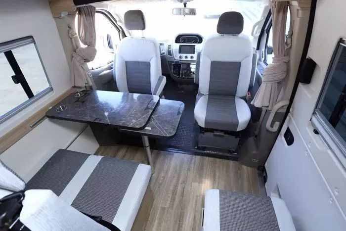 会客区采用2+1的布局方式,带有三个沙发座椅和一个可调节餐桌,座椅均配有安全带,行车途中也能使用,不过受空间所限,双人沙发座椅为固定式不可调节,长时间使用对于舒适性稍有影响。正副驾驶座椅可以180°向后旋转,旋转以后形成一个五人对坐区,驾驶室与后车厢之间配有隐私帘,驻车以后建议拉上拉帘,保证车厢内部的私密性。