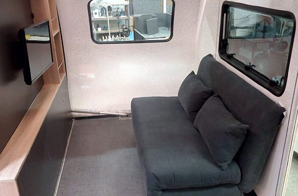 科诺斯Deseo这款搬家工拖挂房车三围尺寸为5990×2300×2580(mm),爱科底盘,整备质量1320kg,最大总质量1500kg。这款车本身只有6米长度,减去A字架占用部分,车厢只有4米空间可用,所以前舱部分设备比较集中。